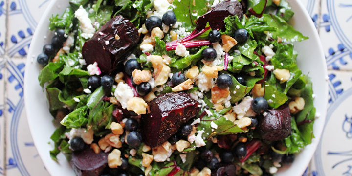 - Top greens with roasted beets, toasted walnuts, blueberries and crumbled feta cheese.