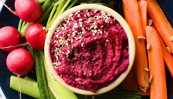 Super creamy roasted beet hummus featuring a whole roasted beet, lemon, and plenty of garlic flavor. Perfect with chips, pita, or veggies or as a sandwich spread.