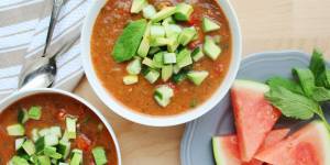 Nothing cools off the dog days of summer like a bowl of this refreshing watermelon chilled soup. It’s subtle sweetness, touch of mint and pretty pink colour make it especially appealing.